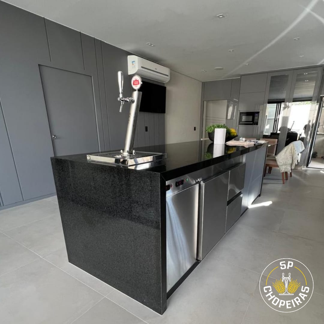 Área gourmet Balcão Refrigerado Aço inox 304, 01 chopp e 02 cerveja e 01 seca equipamentos Vidro fumê, perfil preto. Peça um orçamento